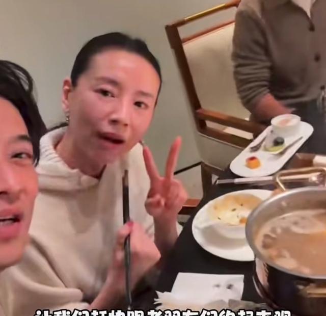 吃得差不多的时候,郑奇举手机和董洁自拍,这时候的董洁已经是喝微醺了,脸喝得通红,神志似乎都有些懵了,筷子倒拿着,眼神里透露着一股疲惫感。